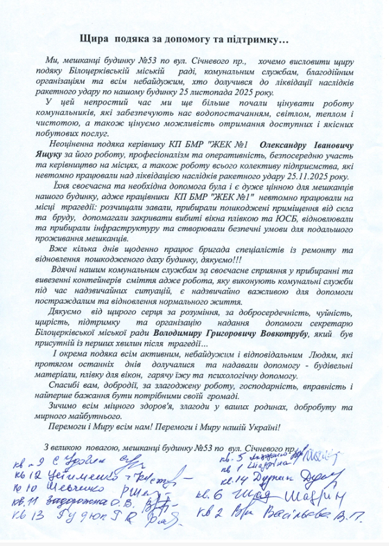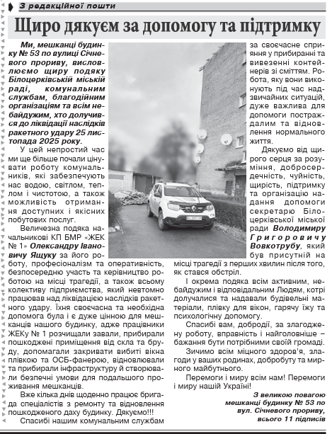 Особливо цінним для нас був відгук у газеті «Громадська думка» від співвласників будинку №53 по вул. Січневого прориву. Їхня подяка за допомогу в ліквідації наслідків ворожого удару — це велика честь і водночас величезна відповідальність.